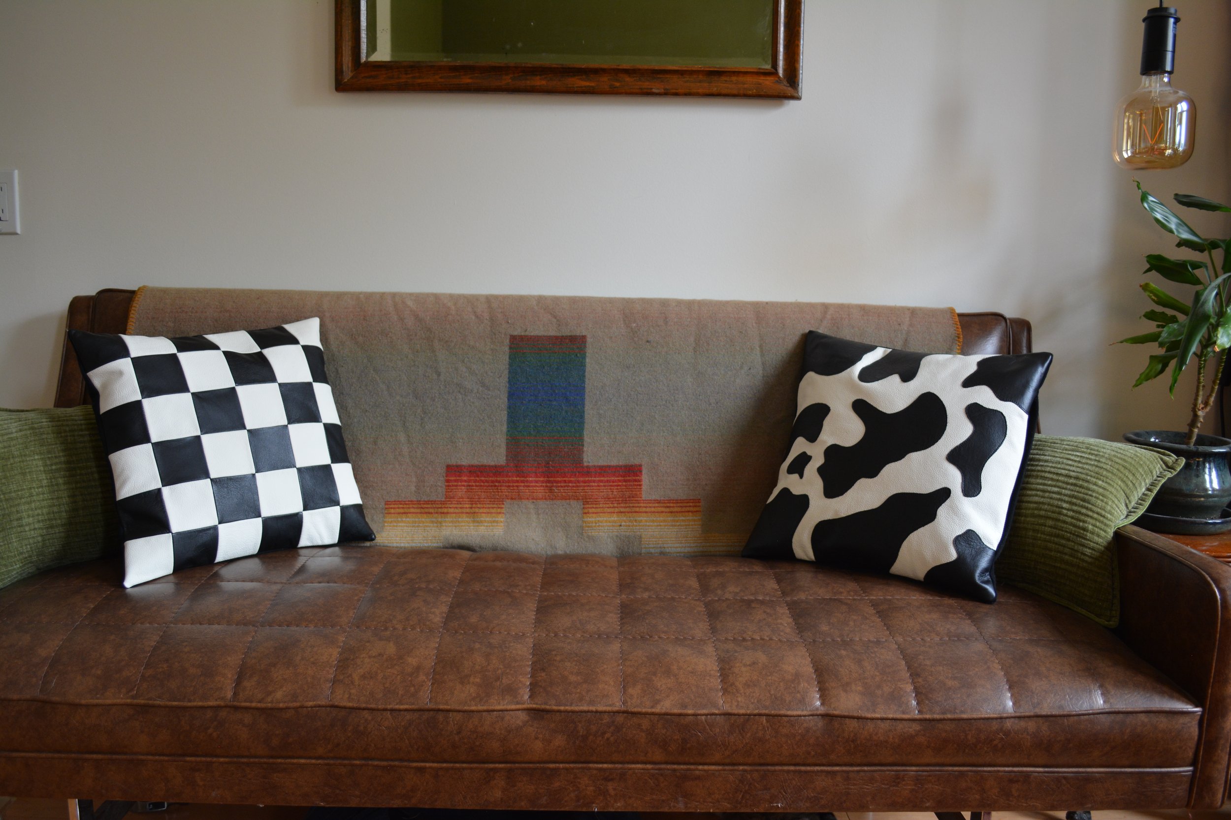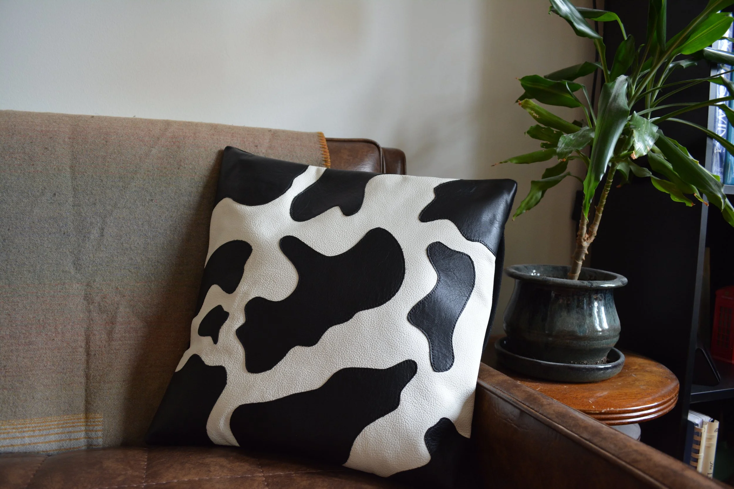 Leather cow print pillow. Backed with wool and has a down filled insert.