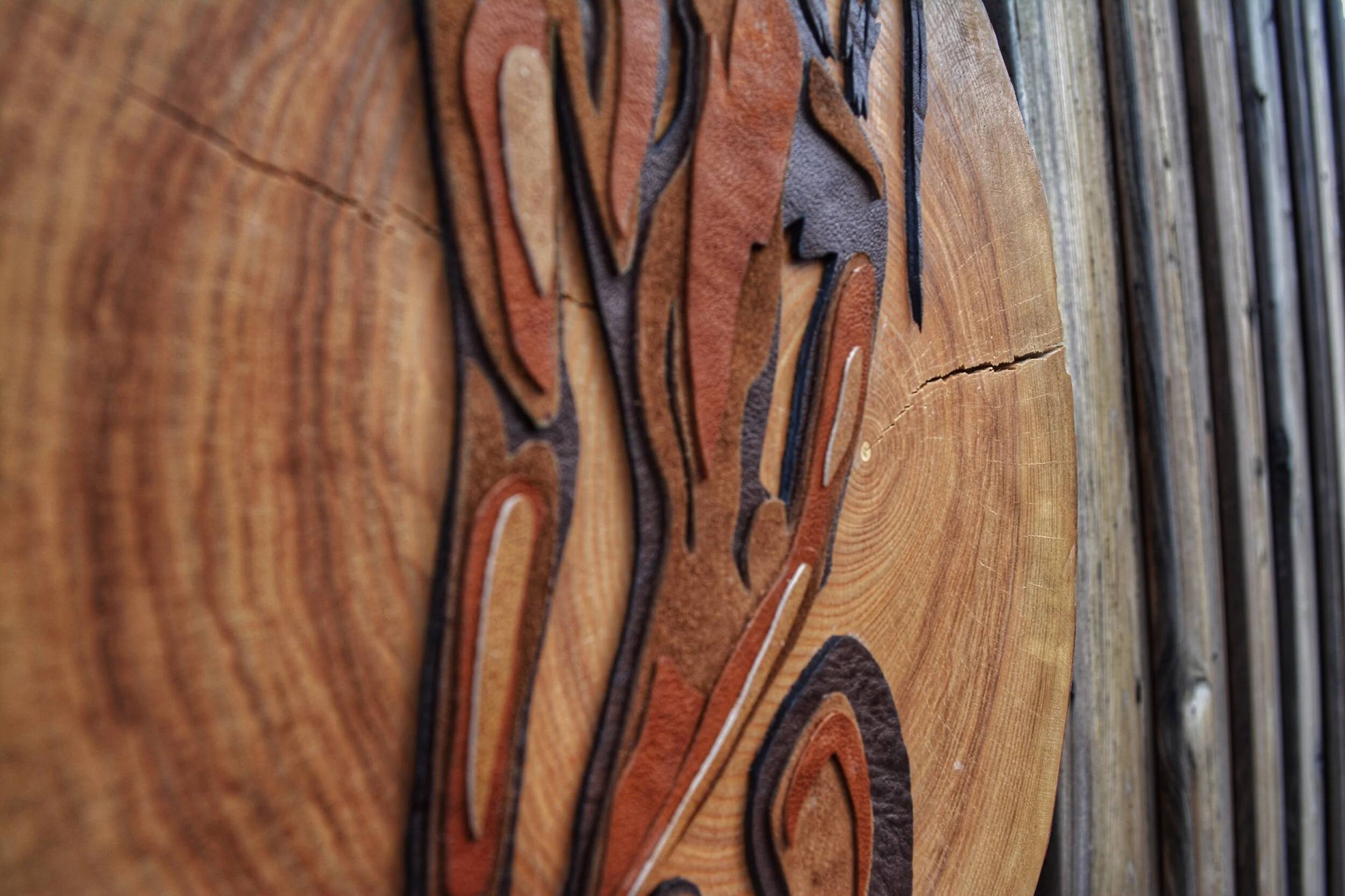 10.5“x9.5” this piece is mounted on an Ash wood round, and has two sawtooth brackets for hanging.