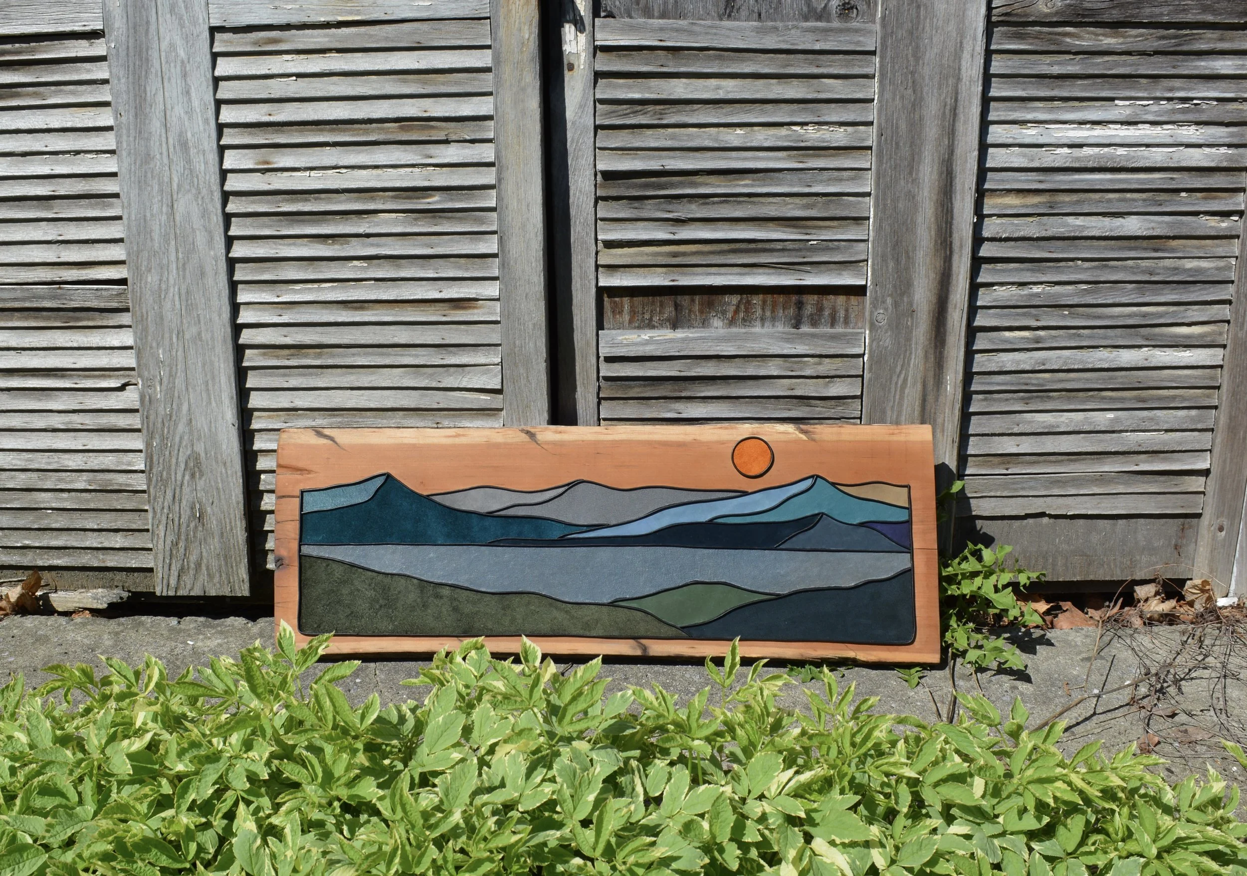 This piece is mounted on a 32”x10” wood plank, and has two sawtooth brackets for hanging.