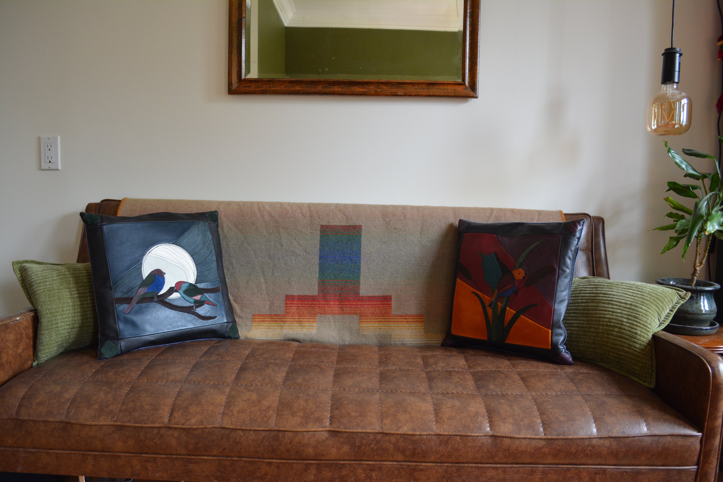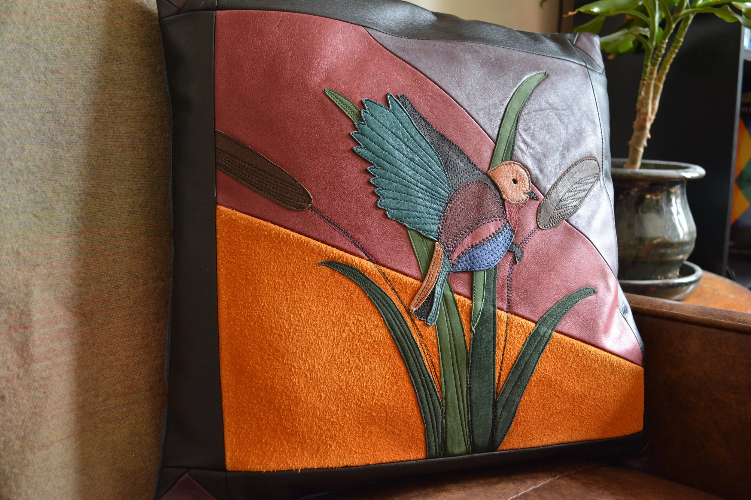 Bird in the Cattails leather pillow. Backed with wool and has a down filled insert.