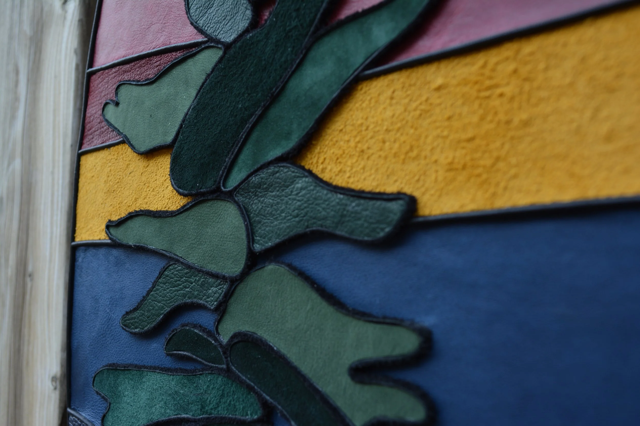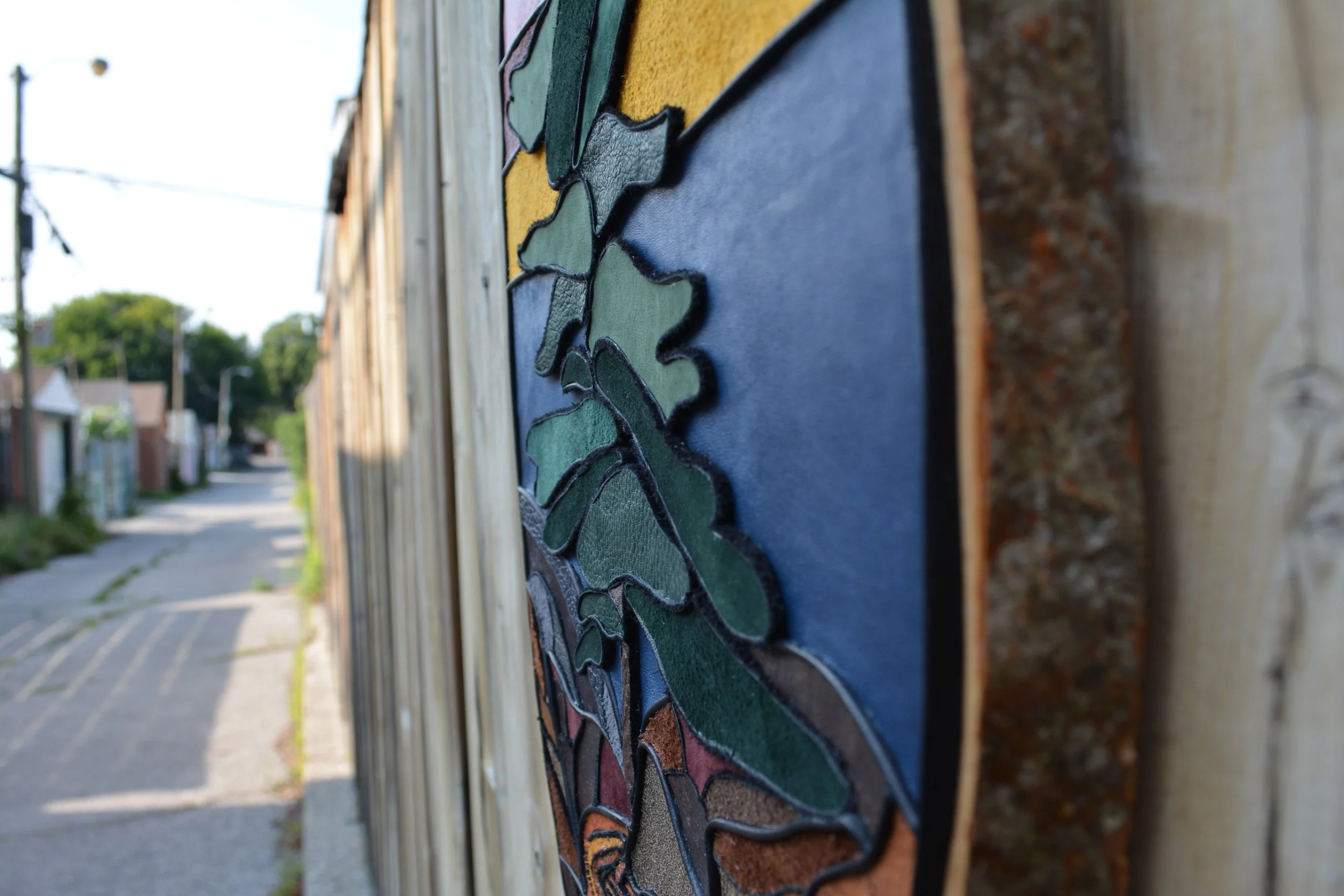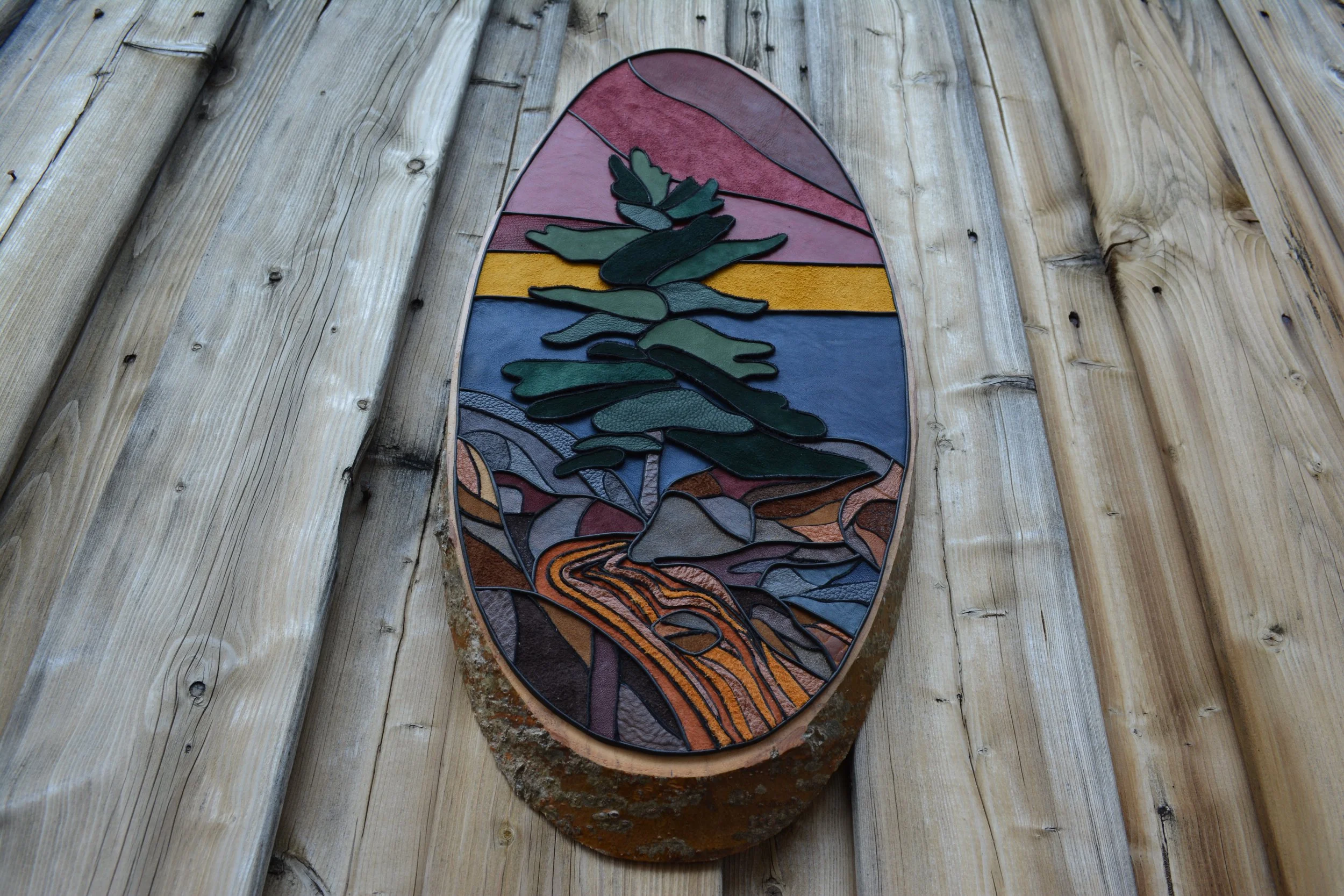 22.5”x10.25” this piece is mounted on an aspen wood round, and has two sawtooth brackets for hanging.